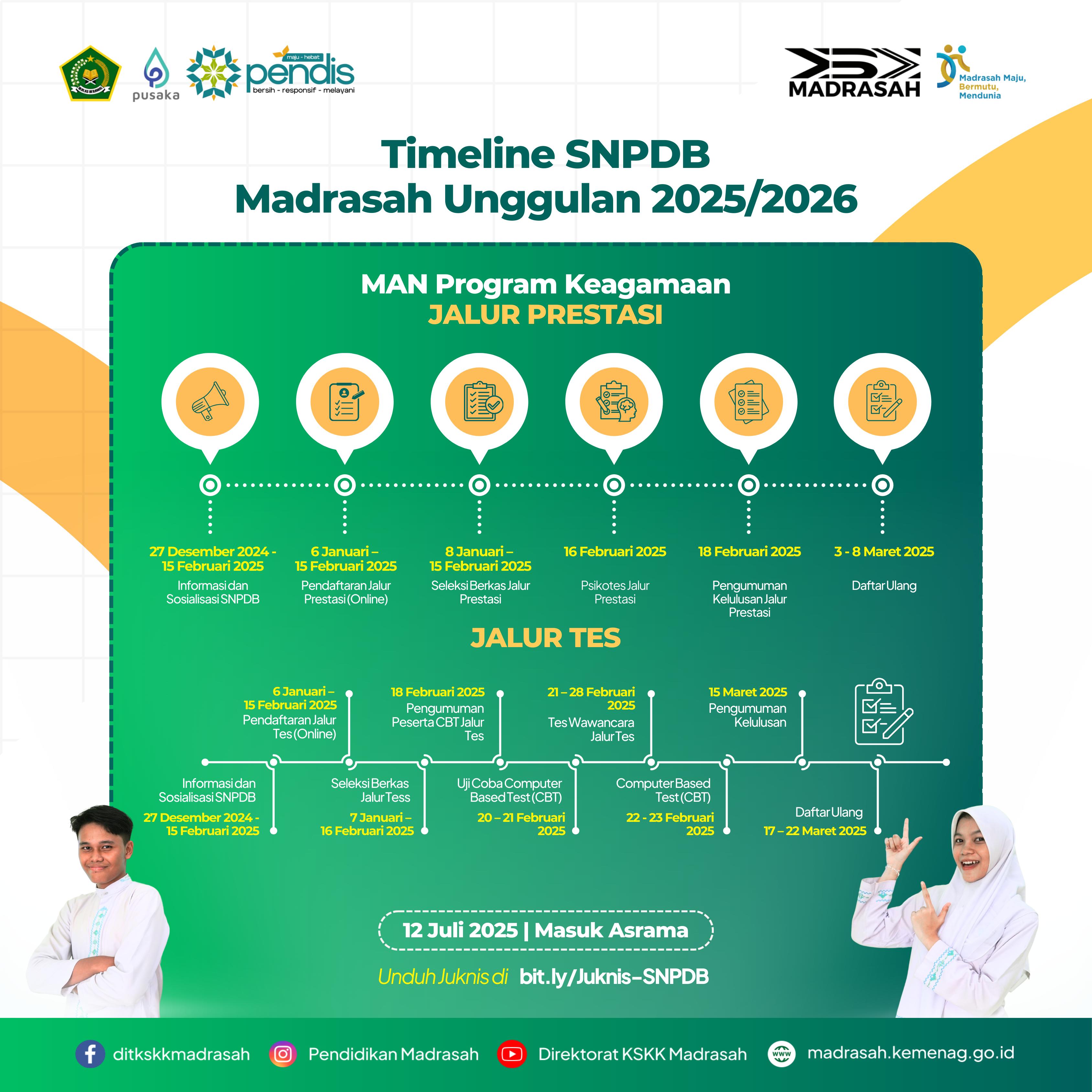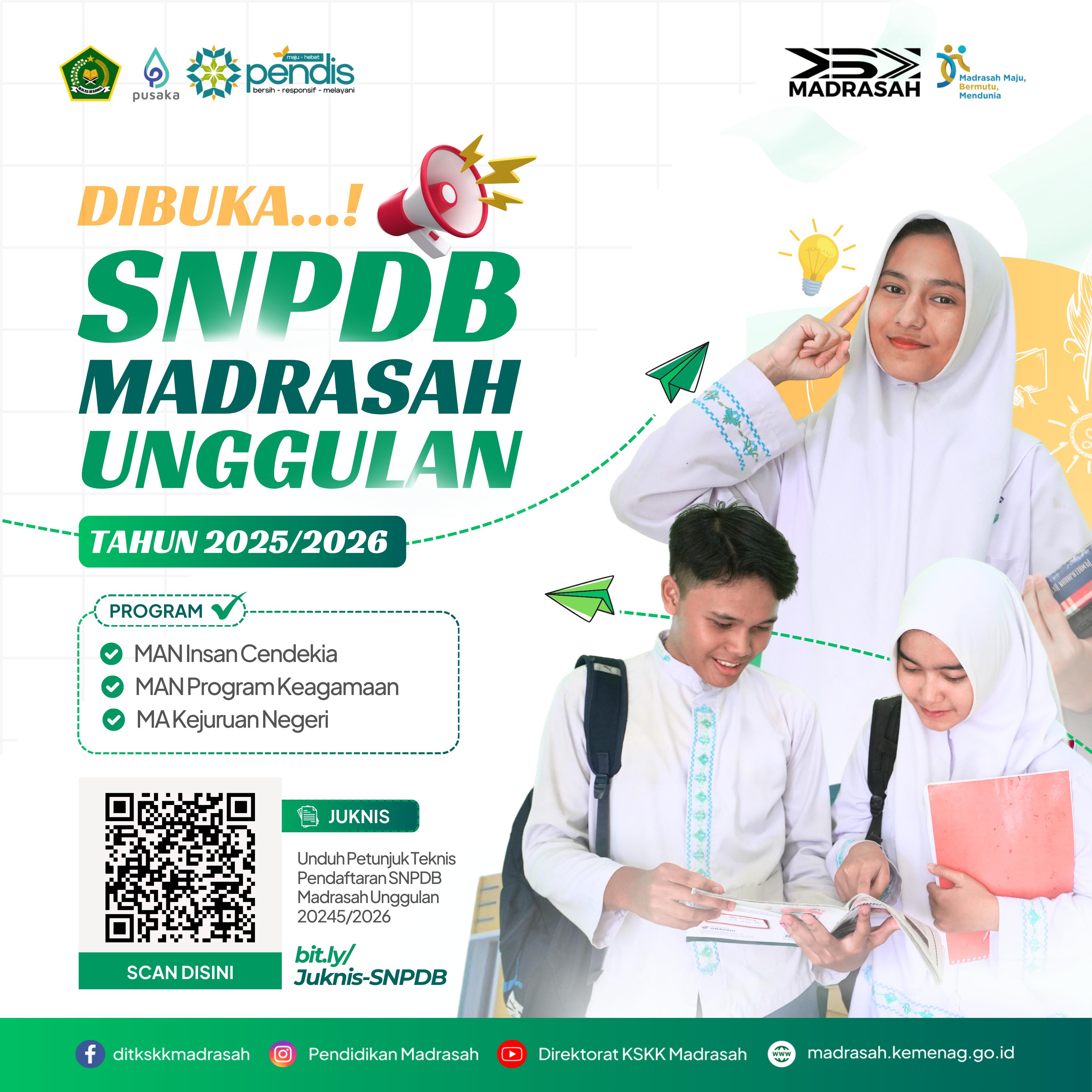 SNPDB Kuningan MAN membuka kesempatan bagi putra-putri terbaik bangsa untuk menjadi bagian dari madrasah unggulan yang memadukan ilmu, iman, dan amal. Daftar sekarang dan wujudkan cita-citamu bersama kami!